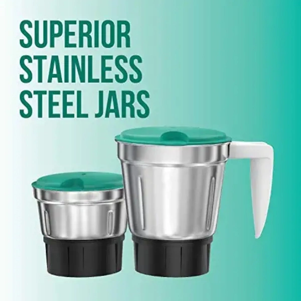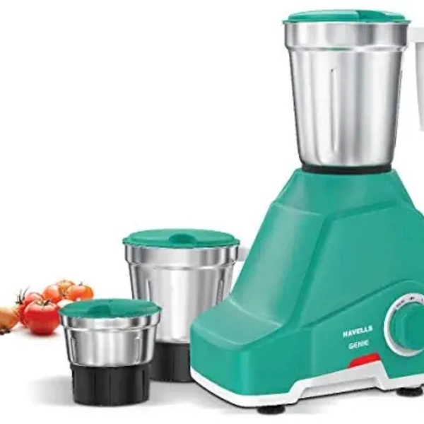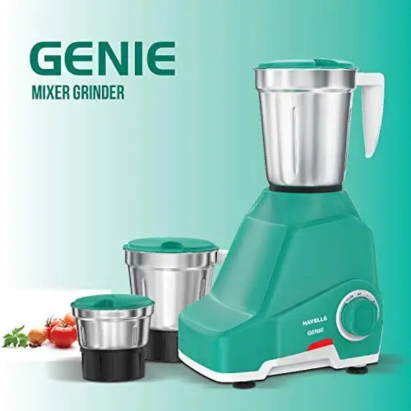 Key features of havells genie 500-watt juicer mixer grinder (green) speed control knob mixer grinder superior 304 grade stainless steel blades built-in overload protector for motor safety easy grip handle 3 step speed control with pulse function 500 w power consumption . Chutney jar: 0.4 L, Multipurpose jar: 1.0 L , Liquidizing jar: 1.5 L and Spatula : plastic spatula. Motor: 500 watt heavy duty motor, Power:500 watt, Operating Voltage 220-240 volt